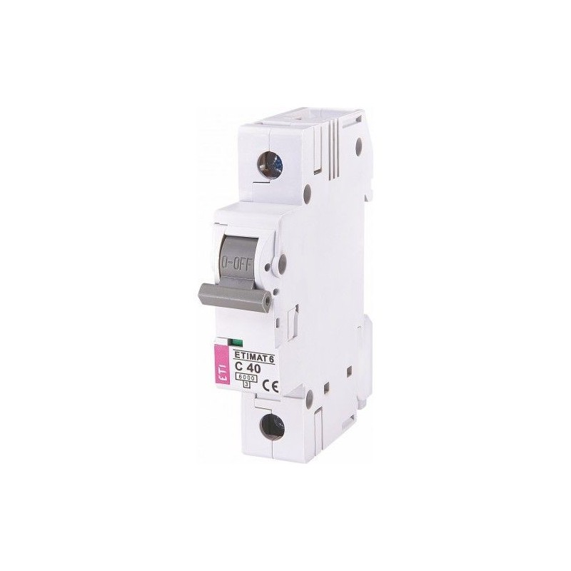 Автоматические выключатели ETIMAT 6, 1 полюс, характеристика C, 40А (6 kA), ETI предназначены для защиты сетей электроснабжения и приборов от тепловой перегрузки и от короткого замыкания. Модульные. Устанавливаются в распределительный щит. Возможна установка дополнительного оборудования: дополнительный контакт, сигнальный контакт, независимый расцепитель, расцепитель минимального напряжения.