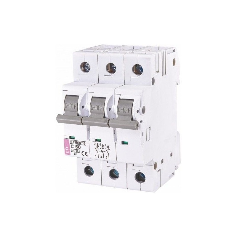 Автоматические выключатели ETIMAT 6, 3 полюса, тип C, 50А (6 kA), ETI предназначены для защиты сетей электроснабжения и приборов от тепловой перегрузки и от короткого замыкания. Модульные. Устанавливаются в распределительный щит. Возможна установка дополнительного оборудования: дополнительный контакт, сигнальный контакт, независимый расцепитель, расцепитель минимального напряжения.