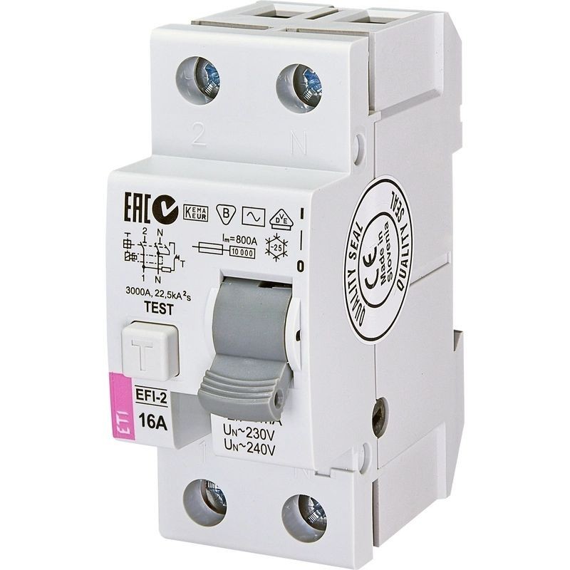 Дифференциальное реле (УЗО) 16А, тип А, ETI 2061260 имеет ток утечки 30мА. Предназначено для защиты человека от поражения электротоком вследствие его утечки через поврежденную изоляцию электроприборов или кабелей.
