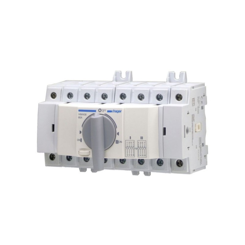 Переключатель ввода резерва (перекидной рубильник) 80А, 4 полюса, HIM408 Hager используется для ручного включения резервного питания от трехфазного генератора, инвертора или резервной линии электроснабжения.
