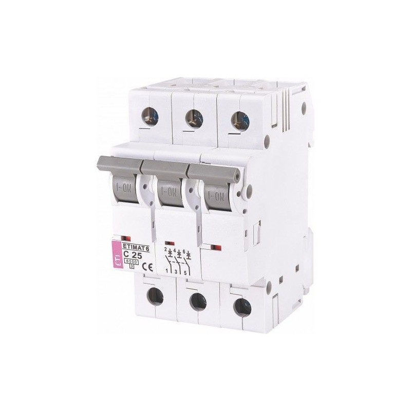 Автоматичний вимикач 25А, 3 полюса, тип C, 6 kA, ETIMAT 6 призначений для захисту мереж електропостачання і приладів від теплового перевантаження і від короткого замикання.